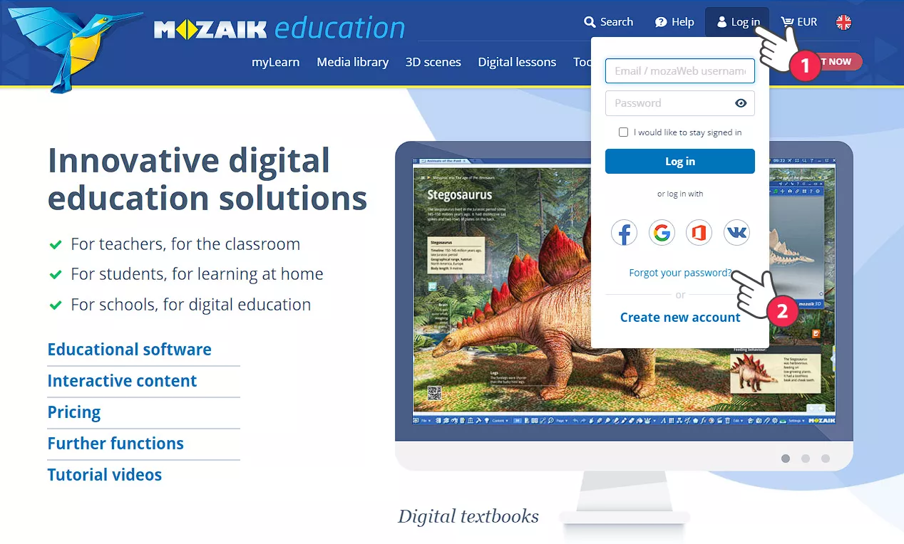 如果您忘记了密码,您可以申请重设密码。 打开页面标题上的登录面板 (1),然后单击“忘记密码?” (2).