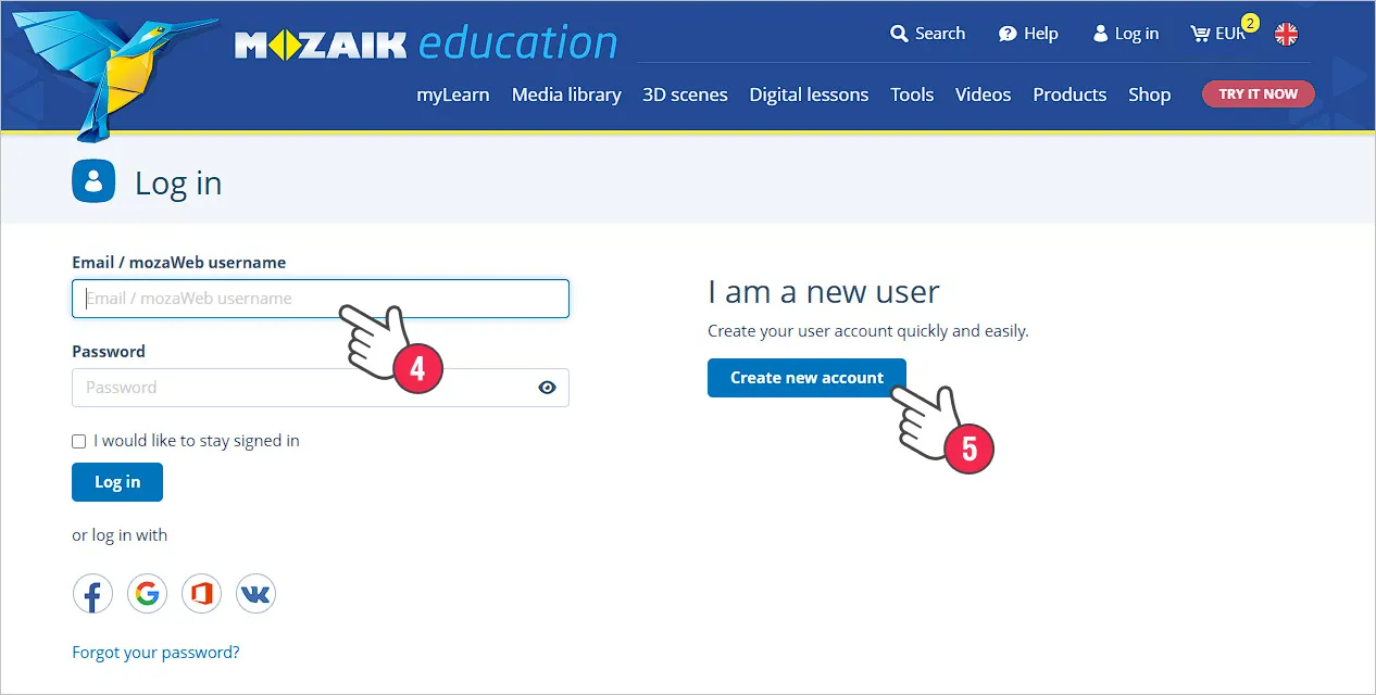 检查添加到购物车的产品。如果一切正确,请点击继续订单确认。如果您之前没有登录,您将被带到登录页面。登录 mozaWeb (4),如果您尚未注册,请选择“创建新帐户”(5)。