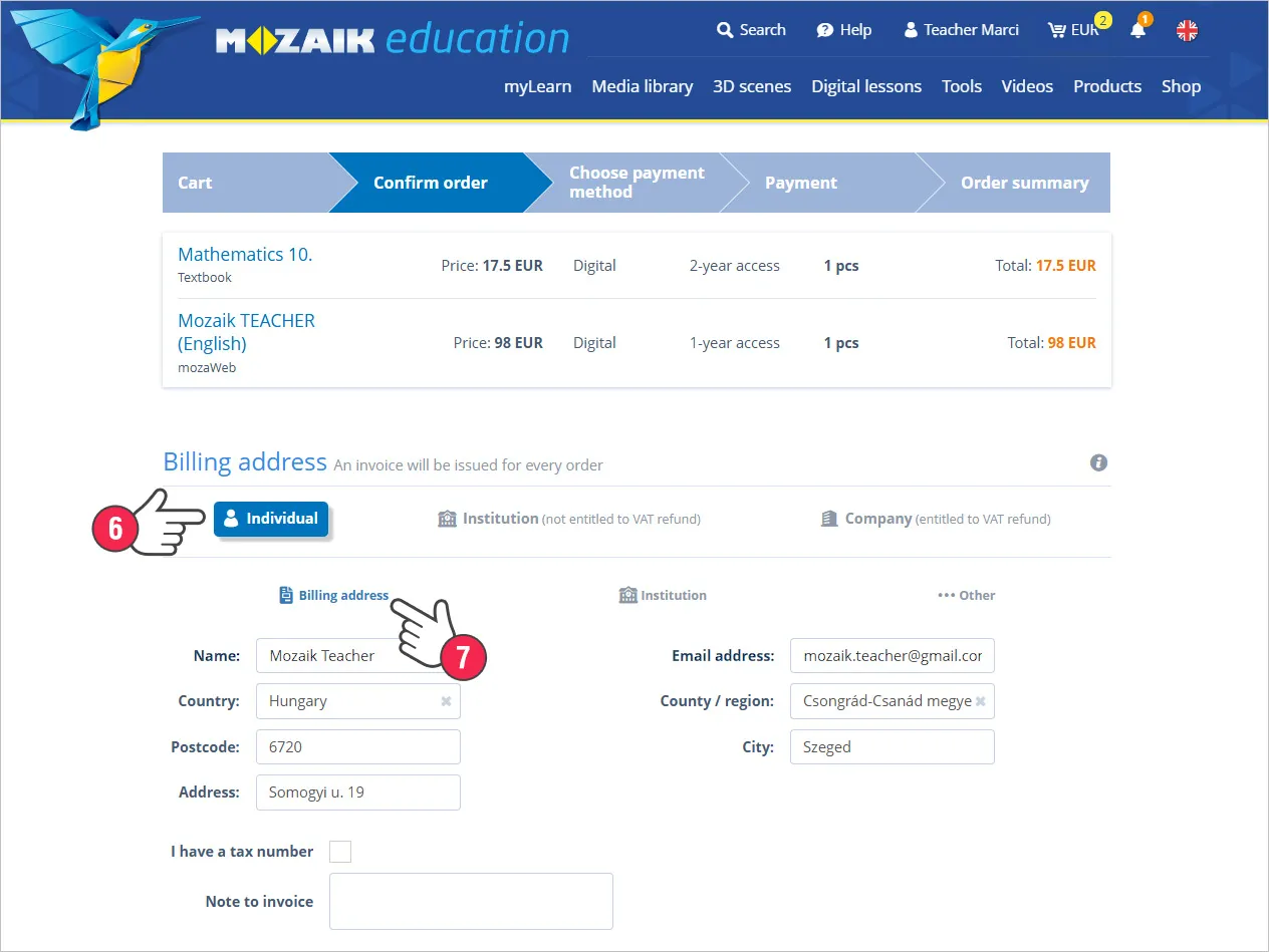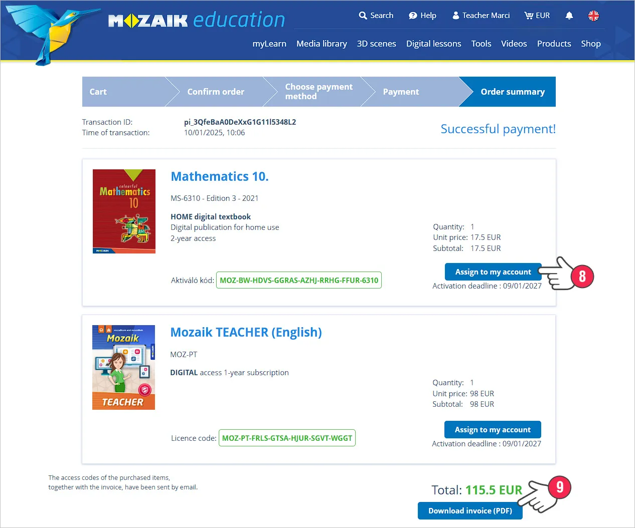 如果付款成功,您将被重定向到订单摘要页面,您可以在该页面查看您购买的产品以及以绿色突出显示的产品的激活码或许可证代码。在这里,您还可以激活您的数字出版物或 Mozaik 学生/教师订阅,将它们分配给您的帐户 (8)。您还可以在此处找到购买发票 (9)。