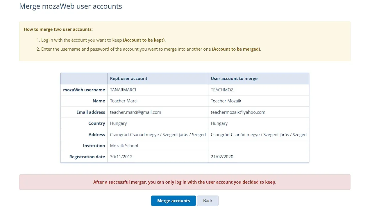 如果表格中的信息正确无误,请点击合并帐户按钮开始合并过程。