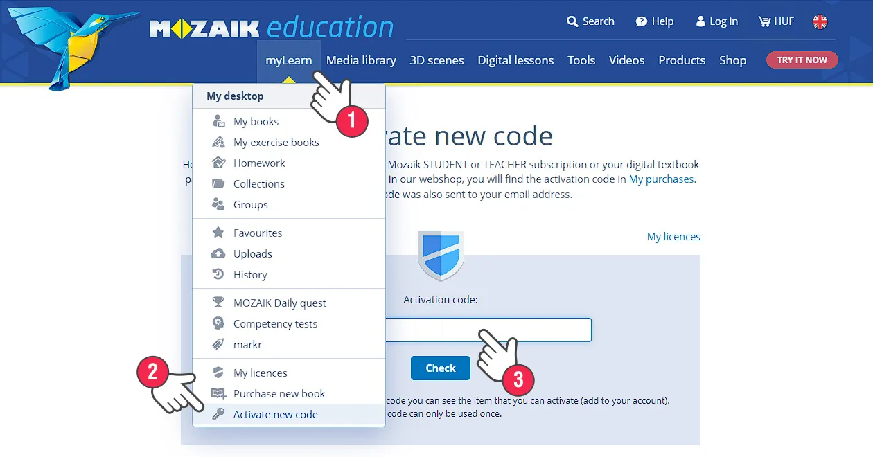 如果您尚未激活 Mozaik 教师/学生许可证,请激活。为此,请使用您的用户帐户登录 mozaweb.com。单击 myLearn => 激活新代码 菜单(或链接),然后输入 Mozaik 教师/学生激活代码: