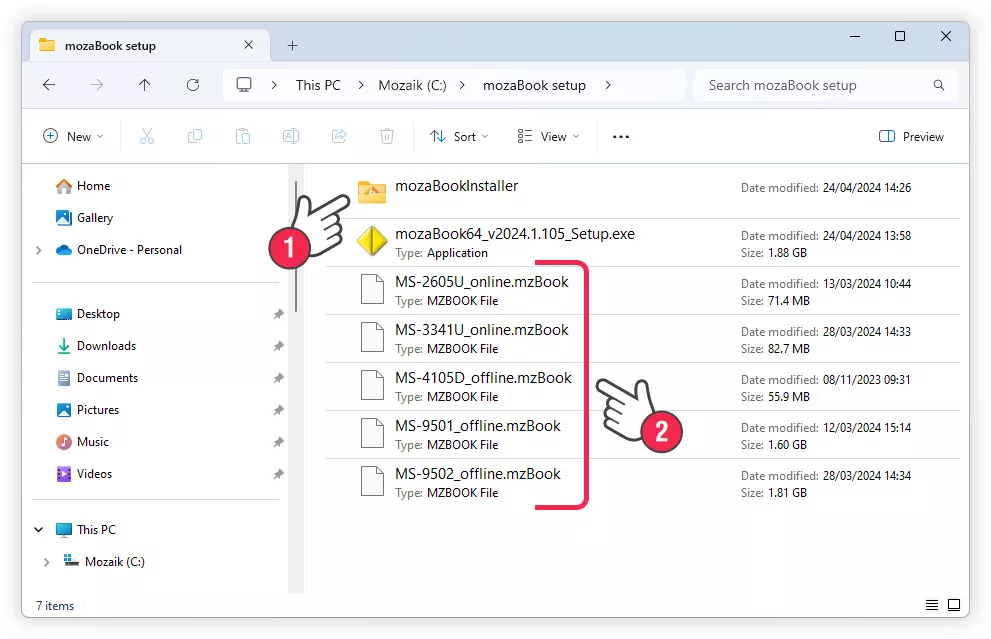 If this folder already exists at the beginning of the installation (1), then missing components will not be downloaded from the Internet but will be installed from the ‘mozaBookInstaller’ folder instead.