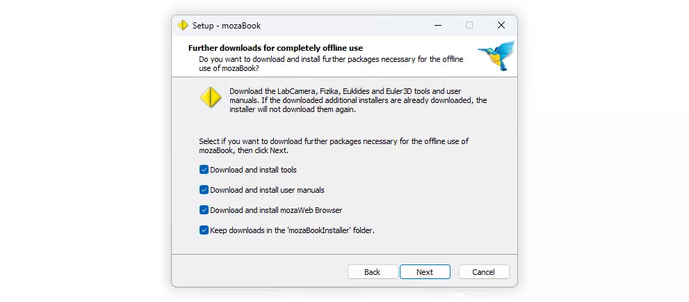 The selected components will be downloaded from the Internet and will be placed into the mozaBookInstaller folder.