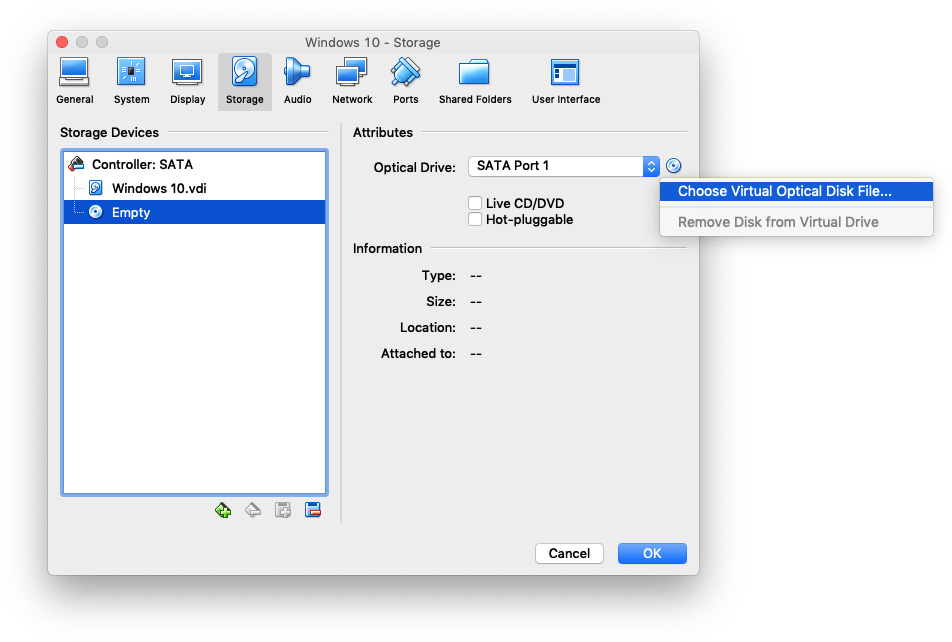 作成したら、設定するボタンをクリックして仮想マシンの設定にアクセスできます。ここで、ストレージメニューから空のCDドライブを選択し、右側のCDアイコンをクリックしてMicrosoftのウェブサイトからダウンロードしたWindows 10のインストールディスクを挿入します。