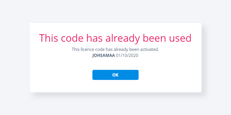 您可能正在尝试激活已被其他用户激活的许可证。在这种情况下,您将看到以下消息: