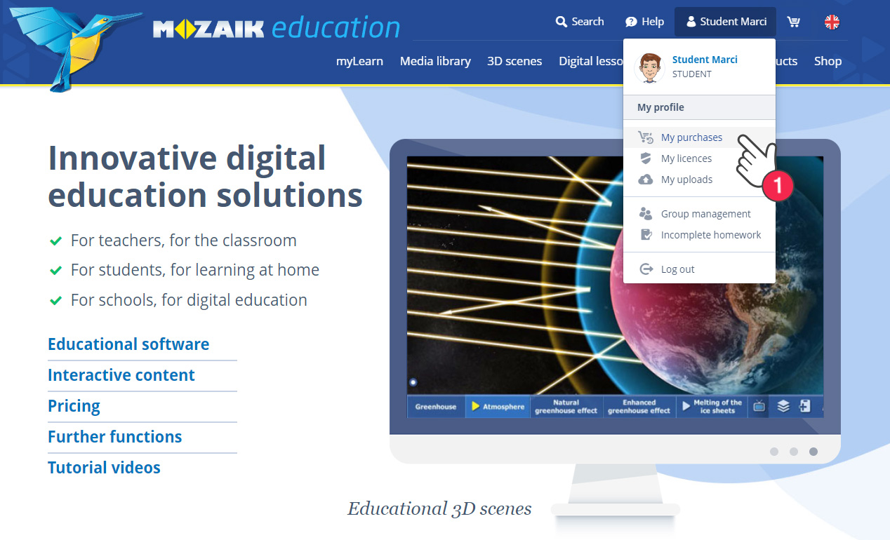 当您单击页面页眉(1)上您的名字时,您可以出现在下拉菜单中的“我的购买”选项找到您所购买的产品。