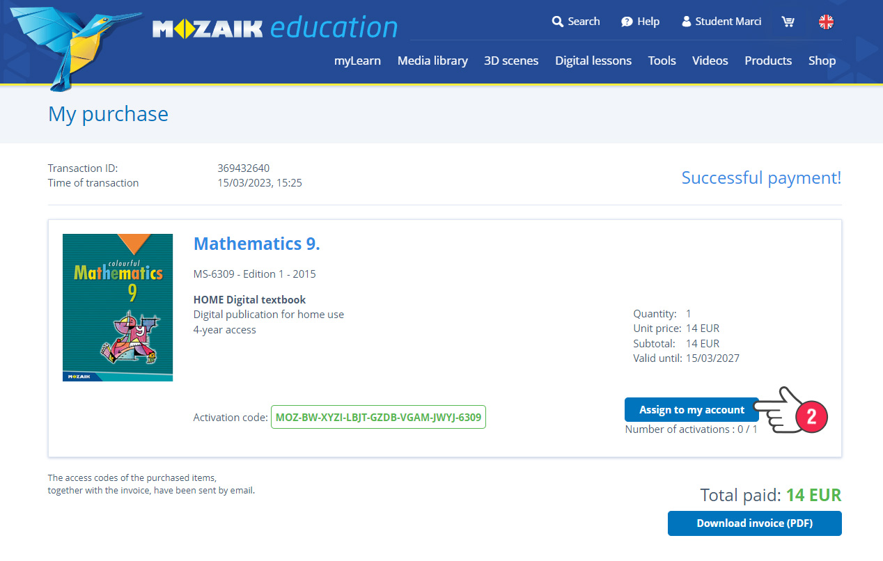 在使用的电子出版物之前,您必须激活它们。这意味着,您必须将此书指定到您的mozaWeb用户帐户。如果您购买的图书是为您自己使用,您可以在购买后立即指定到您的帐户(2)。