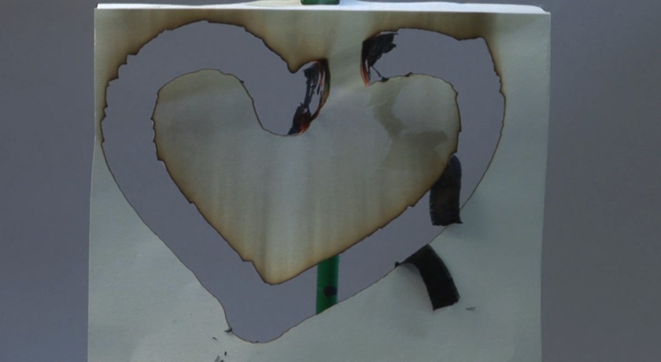 We burn a heart in a piece of paper with the help of oxygen produced upon the decomposition of the potassium nitrate solution.