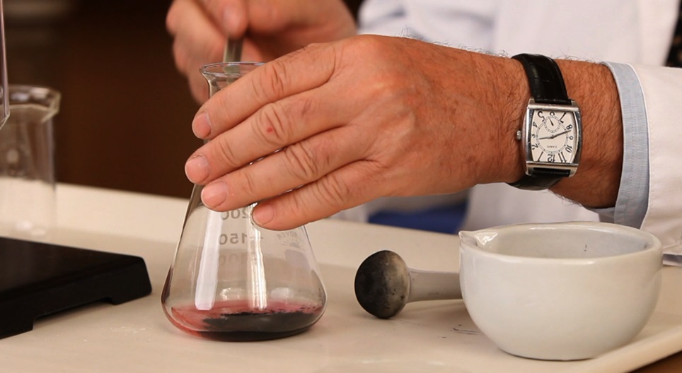 Purifying a solution coloured with fuchsine dye with finely ground activated carbon granules and a filter.