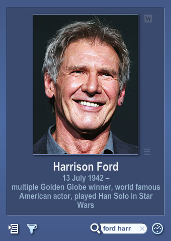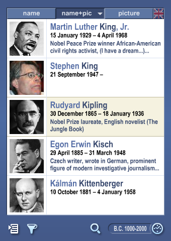 If you double click on a person in the list view, an enlarged picture, birth (and death) date(s) and the most important basic information on the person is displayed. Knowledge thirsty students should click on the ‘W’ icon in the right top corner of the information view: this icon leads to the Wikipedia article on the person concerned. Thus the app can be used for both the simple identification of famous people and as a starting point for project work including complex research on certain people or certain historical periods.