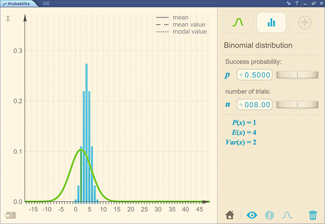 But the best feature of all is definitely the possibility to superimpose different distributions and play around with them. Here we can see how, as the number of trials in a binomial distribution increases, the distribution resembles a normal distribution more and more.