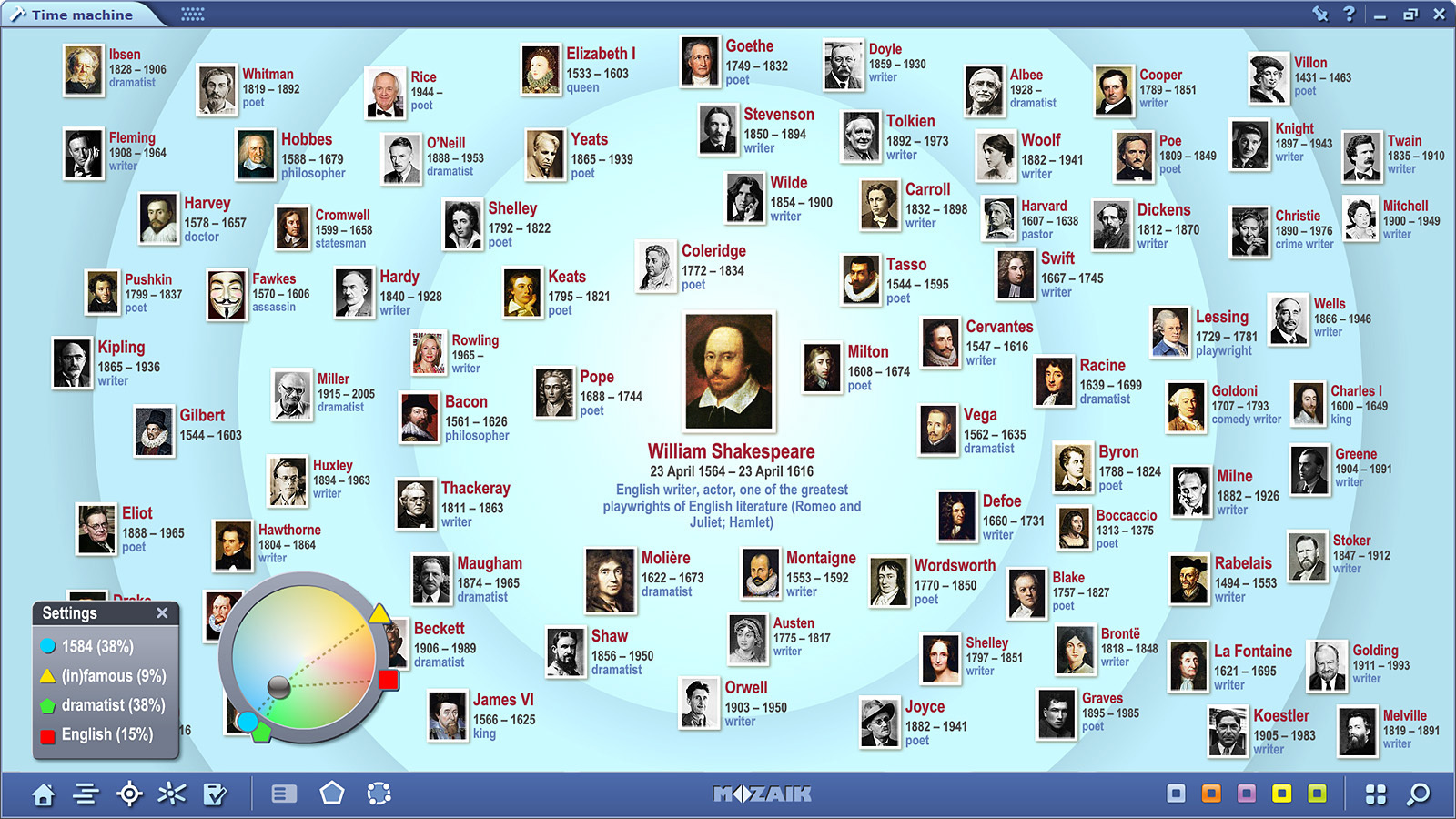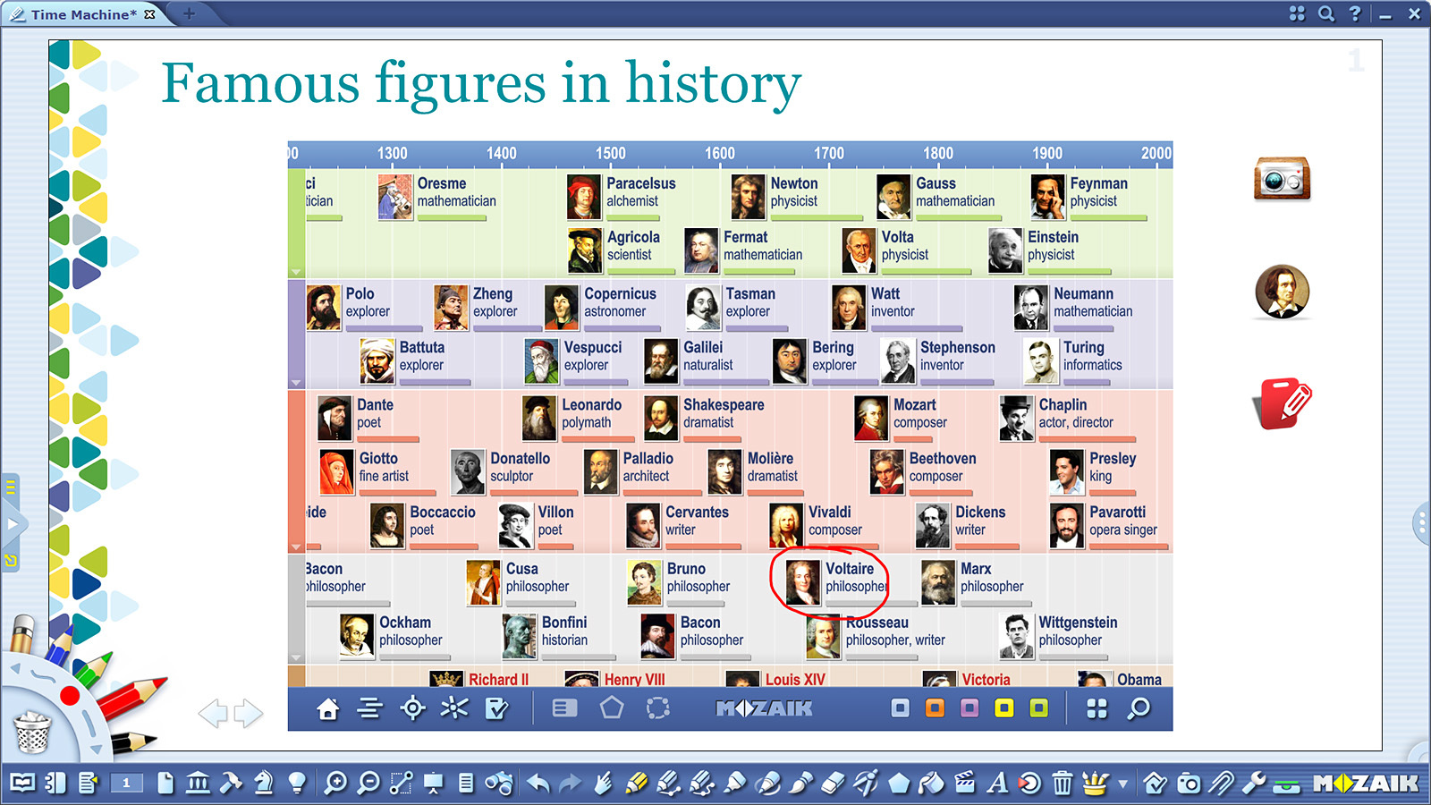 Here at Mozaik we are passionate about History and really want this wonderful subject to flourish in classrooms all over the world. One of the ways we are hoping our software can inspire students to learn history is our absolutely unique educational tool called “Time Machine”. Time Machine is designed to help students make connections between historical personalities according to their nationality, profession, date of birth and (in)famousness.Time machine includes a huge database of historical personalities that is not only regularly updated but is also customised for the local curriculum of your country. It also includes direct links to Wikipedia articles about every historical personality that is included into the database. As most of our educational tools, Time Machine has an inbuilt test function, that lets users test their knowledge of historical personalities. Users can choose from six different test modes that include a huge database of preset questions about chosen sets of historical personalities.