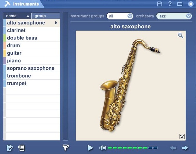 The instruments can be filtered by class or type of orchestra (the class is actually marked by colour codes in the list of instruments).