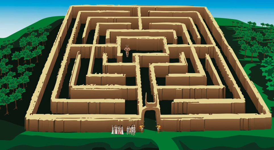 神秘的な迷路での牛の頭と人間の体を持つ獣、ミノタウロスとテセウスの戦いです。