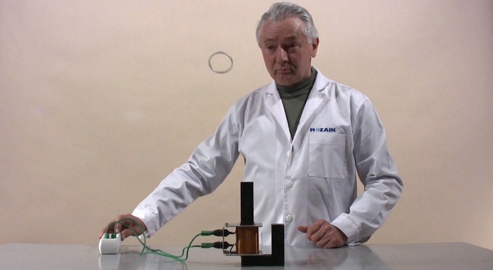 アルミニウムのリングを電磁コイルの上に置き、コイルに電流を流すとどうなるか見てみよう。