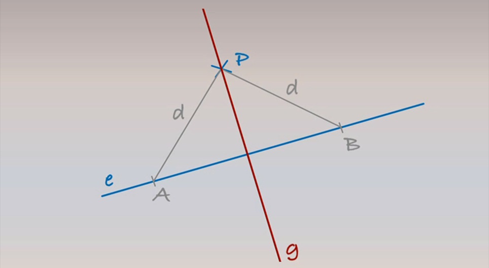 線の上に位置する線Eと点Pは、与えられていません。点Pを通過し、線Eに垂直である線Gを描きましょう。