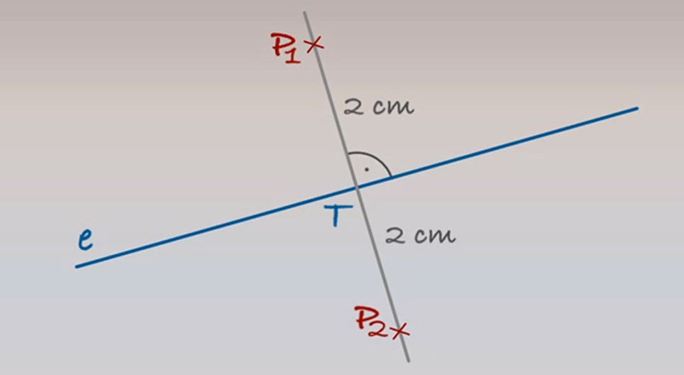 線Eが与えられています。線Eから、2センチの間隔で点Pを描きましょう。