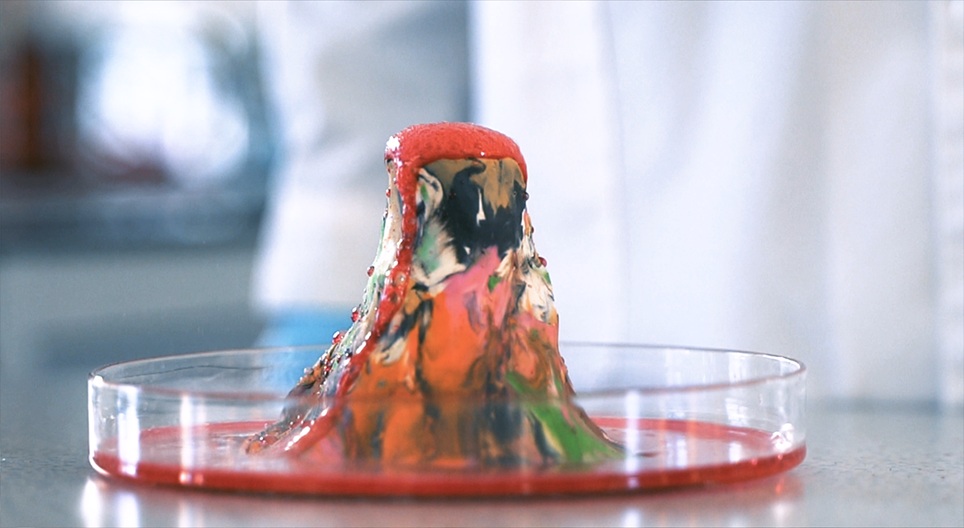 적색 식품 색소로 칠한 식초와 중조의 반응은 화산 활동과 비슷한 모양입니다.