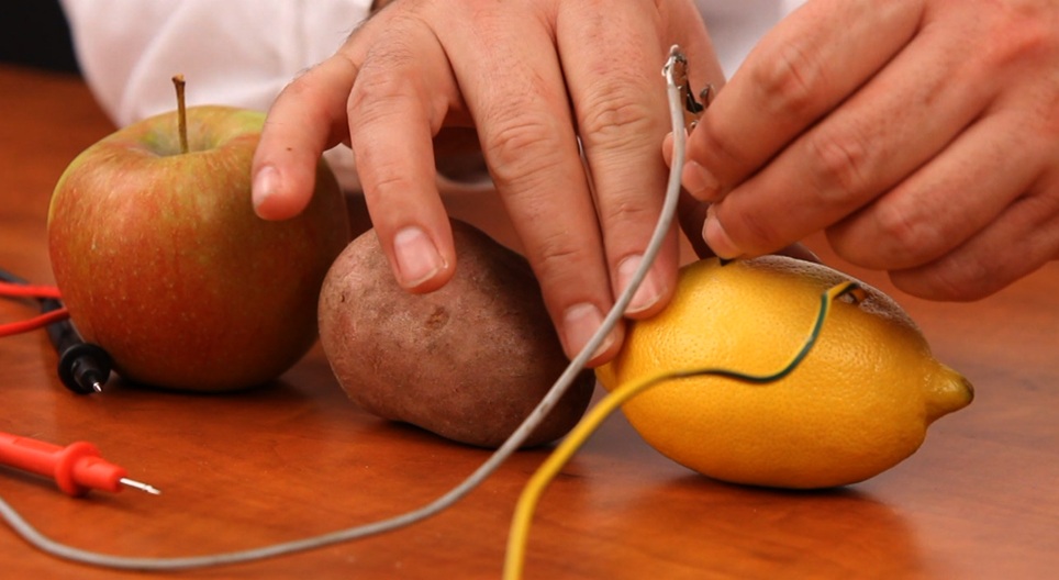 작은 전압의 전류는 다니엘 전지와 비슷한 방법을 따라 과일로도 발생시키기 가능합니다.