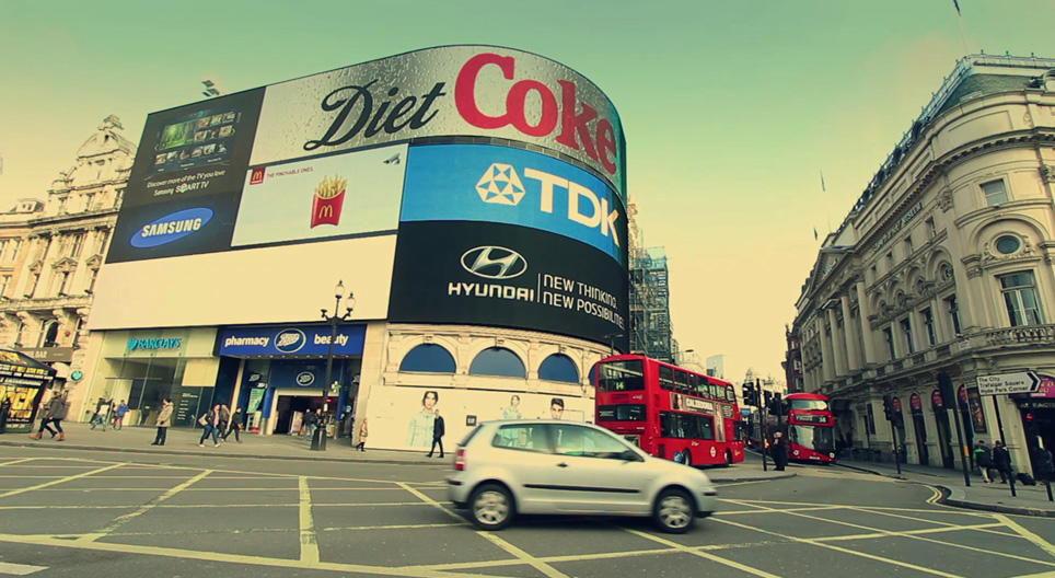 런던의 피카딜리 광장은 북쪽에 있는 건물 모서리의 벽에다 붙인 거대한 영상 직시기와 LED 광고판으로 유명해졌습니다.