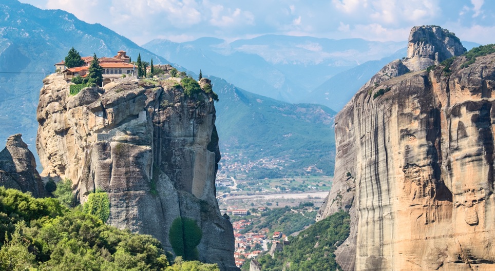 그리스의 산속에서는 수도원을 가파른 바위 위에다 세웠습니다. 이런 기념비적인 건물들은 오늘날 세계문화유산으로 여겨져 있습니다.