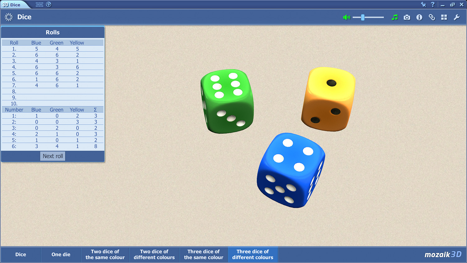 For statistics and probability (besides the best tool in the world (probably!)), our Dice 3D model (below) offers great support. Here the user can roll with different numbers and colors of dice and, as they roll they receive a statistical chart summing up the results, showing us the essence of the rules of chance.