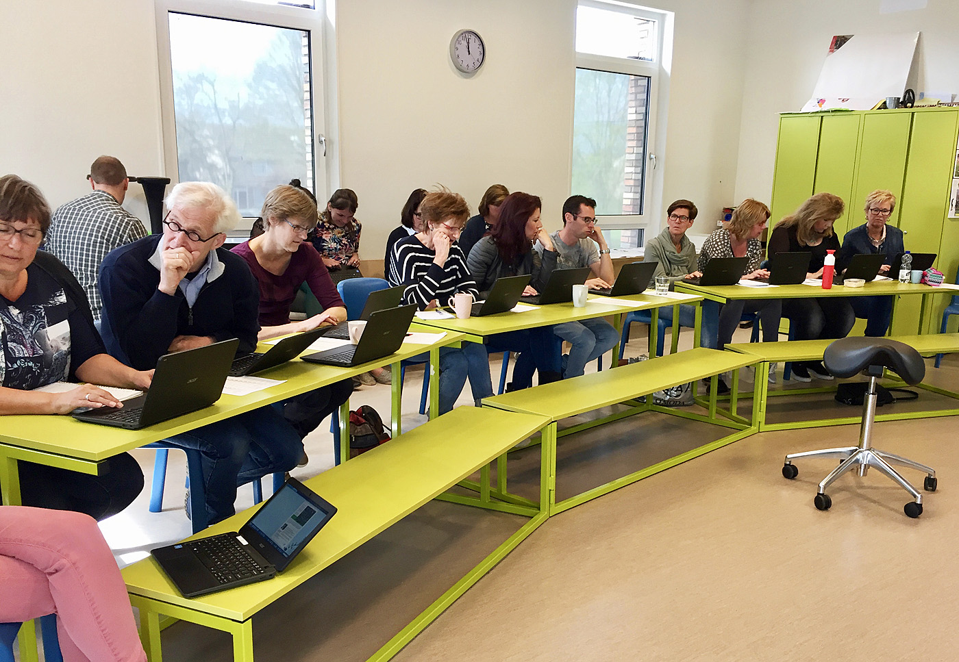 Most schools also order a training package from a Dutch mozaBook wizard, Niek Scholts (Bureau Loren), who developed an engaging and informative training programme in Dutch. The enthusiastic teachers on the pictures are from the Sterrenboom school in Stolwijk, and recently had their week of training with Niek. You can see them working on student laptops during the “digital classroom” session. Next year the Sterrenboom school will join the league of official mozaBook schools and will start spreading the joy of digital education.