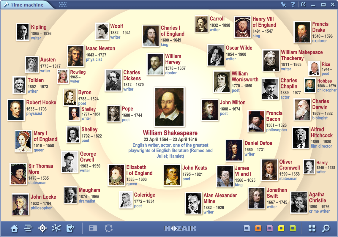 Besides that, we can offer the Time Machine tool which is basically an interactive timeline where you can search for any historical individual and put them in the center of a diagram. Around the selected person a whole bunch of similarly significant people will appear, but you have the option to manage the results as the profession, nationality, or time period can be also set.