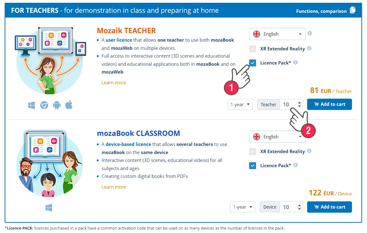 例如,如果您为28名学生的班级购买Mozaik STUDENT许可证,您可以选择购买28个单独的许可证,这样每个学生都会收到一个单独的代码,或者您可以购买一个许可证包然后收到一个许可证代码,将其与所有28名学生共享,他们都可以用它激活。 当然,同样的选项也适用于教师许可证:教师要么收到单独的代码,要么学校为所有教师购买一个许可证包,即一个许可证代码。