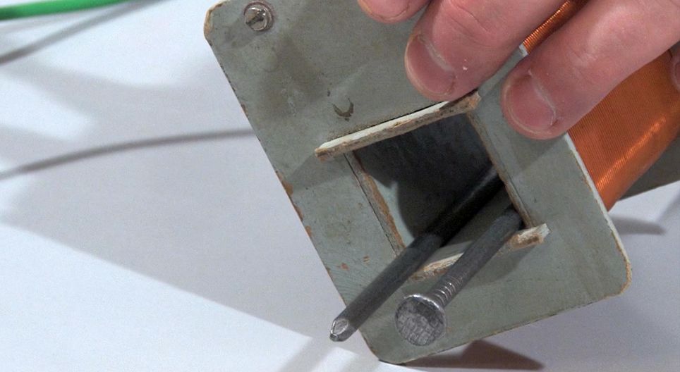 This experiment demonstrates the principles of electromagnetism using iron nails.