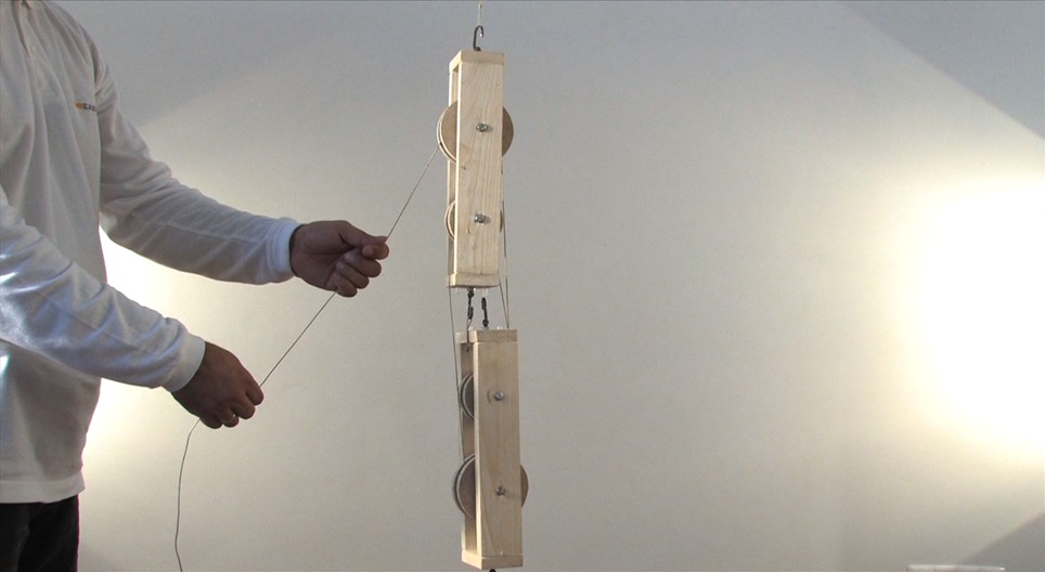 This experiment involves a block and tackle system made up of several moving and fixed pulleys.
